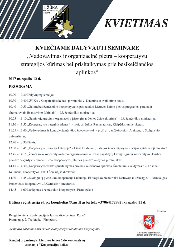 Lietuvos žemės ūkio kooperatyvų asociacija „Kooperacijos kelias“ kviečia dalyvauti seminare „Vadovavimas ir organizacinė plėtra - kooperatyvų strategijos kūrimas bei prisitaikymas prie besikeičiančios aplinkos“.